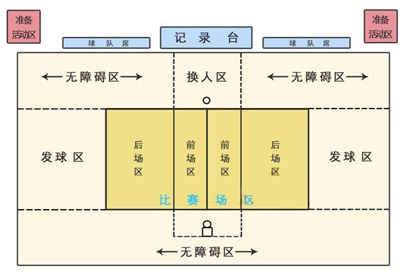 比賽場(chǎng)區(qū)為18米×9米的長(zhǎng)方形。其四周至少有3米寬的無障礙區(qū)。比賽場(chǎng)區(qū)上空有無障礙空間從地面量起至少高7米,其間不得有任何障礙物。**排聯(lián)**性比賽場(chǎng)地邊線外的無障礙區(qū)至少寬5米,端線外至少寬8米,比賽場(chǎng)地上空的無障礙空間至少12.5米高。成年**錦標(biāo)賽和奧運(yùn)會(huì)比賽,基無障礙區(qū)邊線外至少寬6米,端線外至少寬9米。